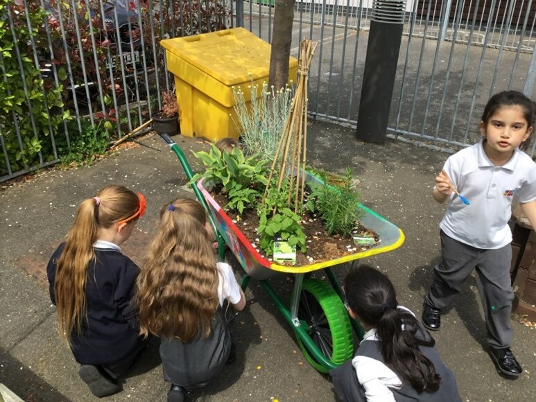 Children from KS1 have been busy at gardening club this half term. They have planted strawberries, sweet peas, broad beans, potatoes, onions, garlic, lettuce, radishes and rainbow chard in the raised beds and taken care of the herb and wildflower patch by watering every week. The school have entered into the Slough Borough Schools Wheelbarrow Competition, which will take place in the Town Square on 15-18th June, the public is welcome to go and see the display! Pupils have planted a fragrant mix of plants and decorated the wheelbarrow with colourful flowers and insects.