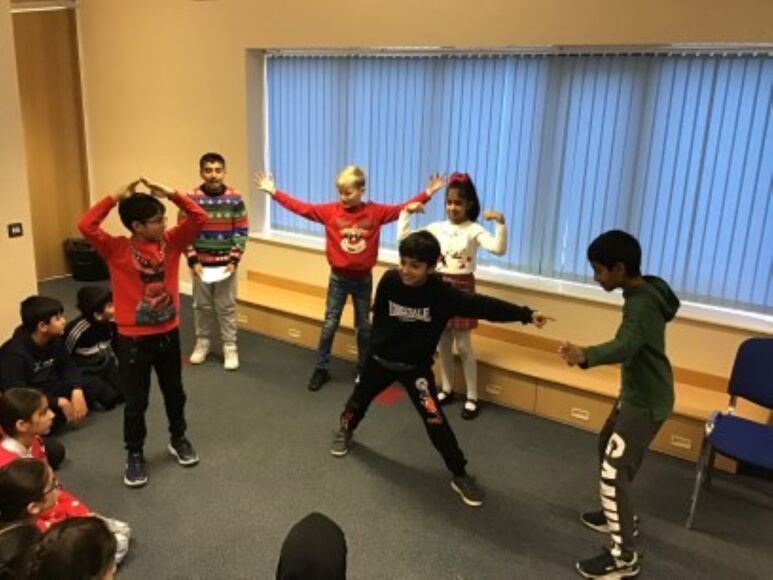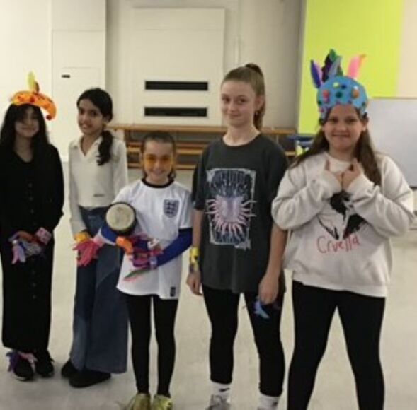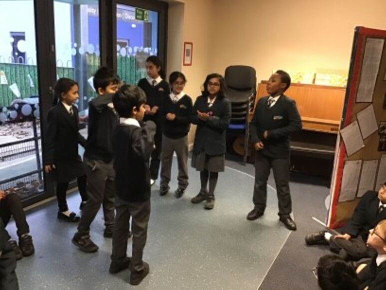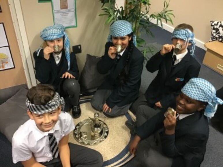 As part of year 5's high stakes project, children put together an exhibition to showcase their work to the whole school. The Islamic Civilisation Exhibition had a variety of work that Year 5 had created over the term as well as an experience zone where children from other Year groups got to dress up as a caliph and sip 'Gahwa' and mint tea while listening to Arabic melodies. They also got to scribe their name using their names in Arabic using decorative handwriting- calligraphy. They also showcased a time line using freeze frame to explain the rise and fall of Baghdad.